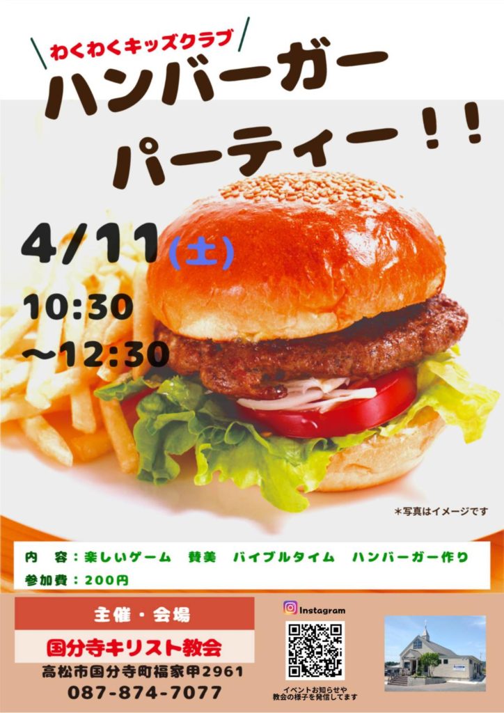 新年度になりました。4月の子ども集会(わくわくキッズクラブ)は、ハンバーガー作りをします。